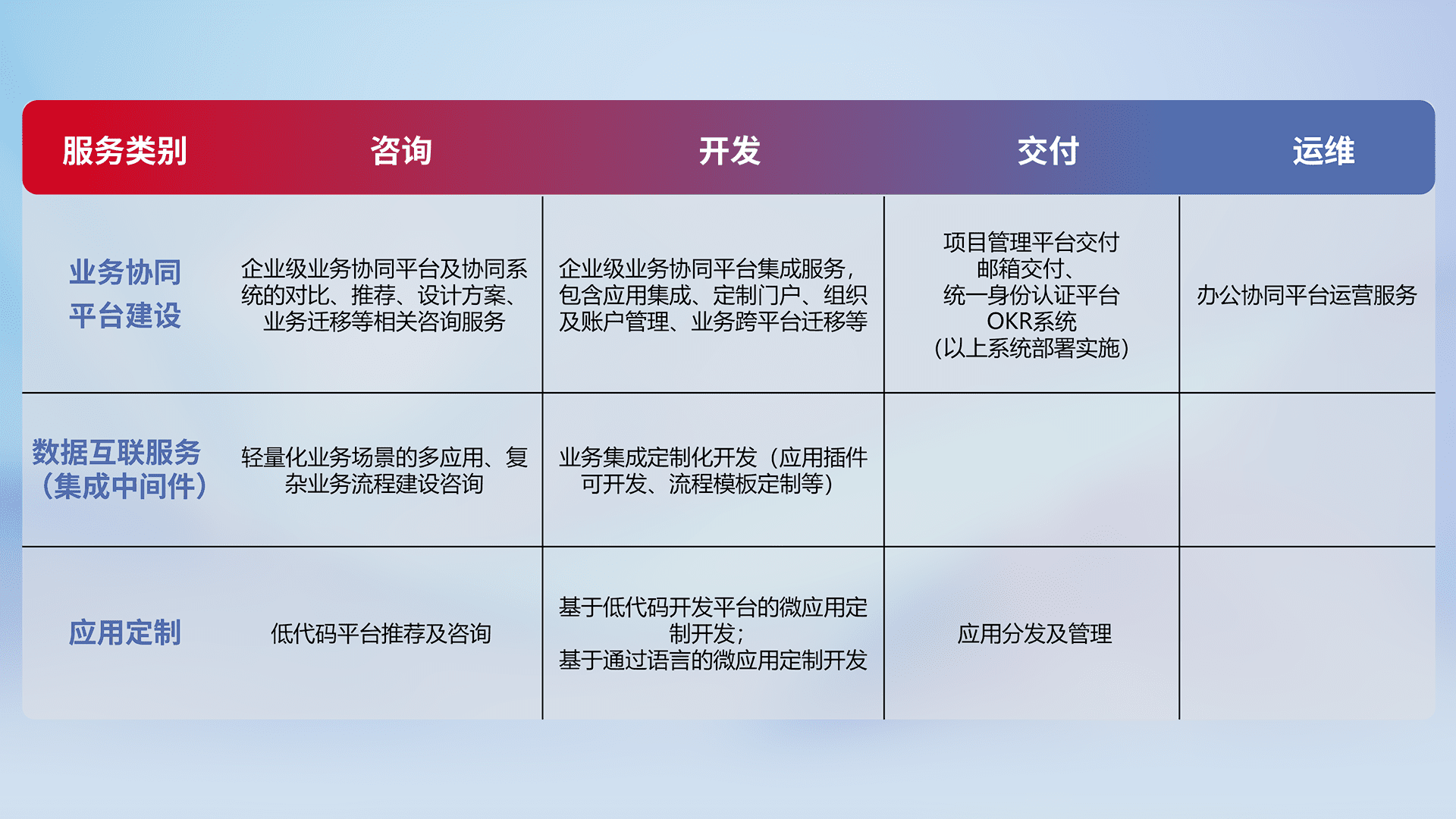 针对钉钉、、企微、、、IDaas等平台级产品提供产品的规划、、、方案、、交付、、、、定制化开发等服务,,实现如统一协同办公、、智能客户服务、、、混合会议管理、、、智能数据查询、、、、等业务场景,,,,实现数字化转型。。。